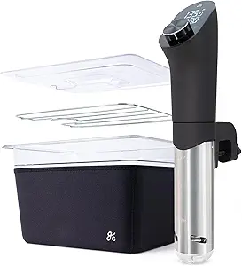 The Greater Goods Kitchen Machine is a solid choice for those wanting a straightforward and efficient sous vide experience. Its high power ensures quick heating, and the simple dial controls make it user-friendly. Although it lacks some extras like a container and wireless features, its quiet and reliable performance makes it a fantastic addition to any kitchen. Perfect for those who want to keep things simple and effective.